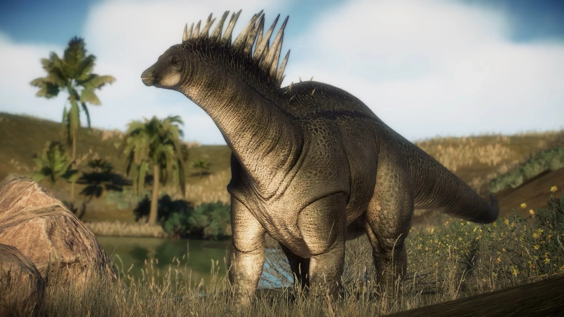 Similar to all land dinosaurs in Evolution 2, the Amargasaurus can drink water and rest when fatigued. Occasionally, when idle, the Amargasaurus will take a seated posture. At times, when two Amargasaurus are in close proximity, one may approach the other in an affectionate manner. Their heads may meet, akin to a hug, before they continue walking side by side for a while, until eventually, one of them moves away.