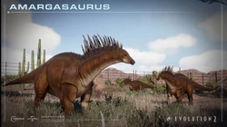 Amargasaurus stood among the initial dinosaurs to be included in Evolution 2, making its debut in the game's announcement trailer on June 11th, 2021. Subsequently, on June 25th, 2021, it was granted a Species Field Guide. Additionally, an official short article investigating the intricacies of this species was posted on the Frontier forums.[1]