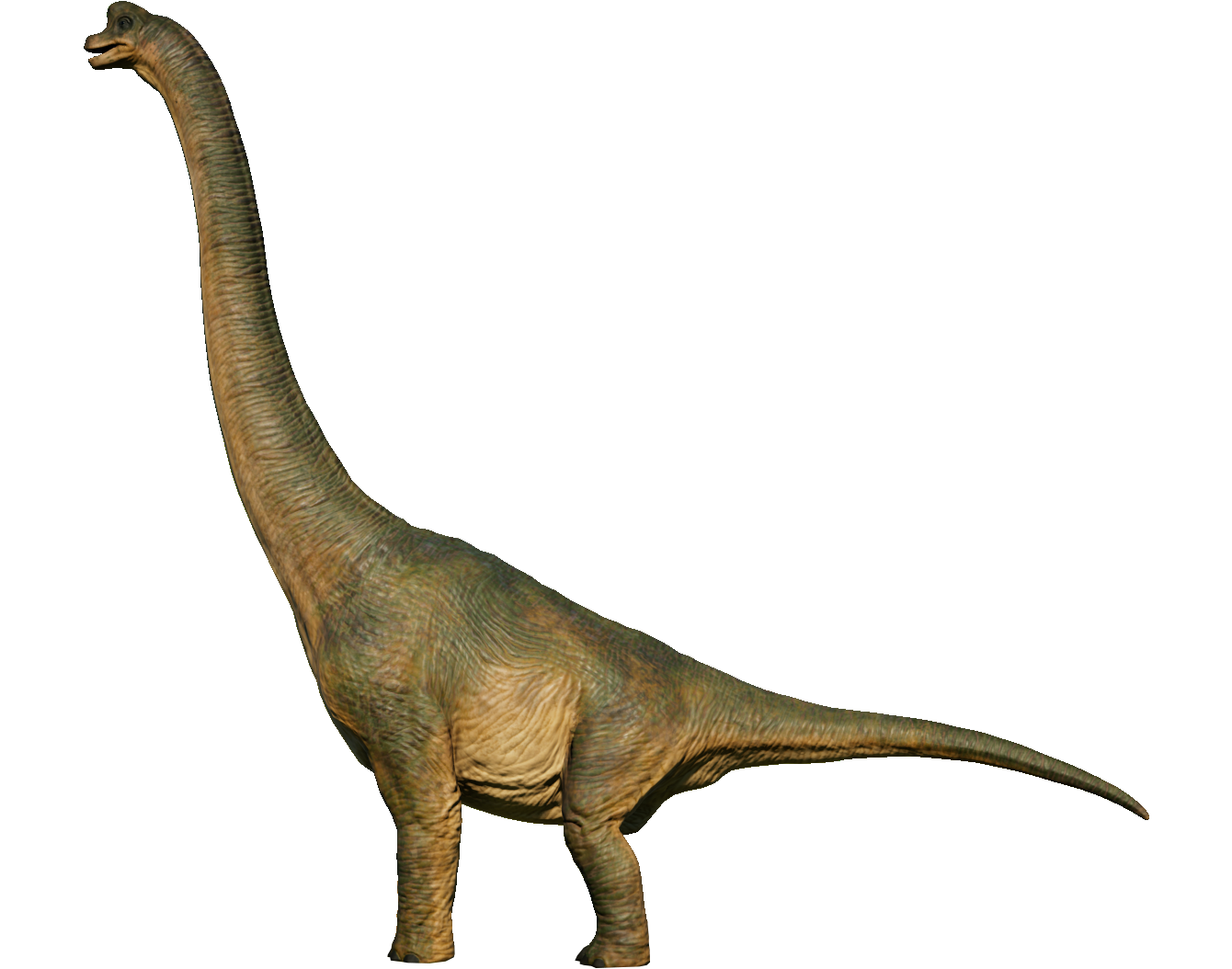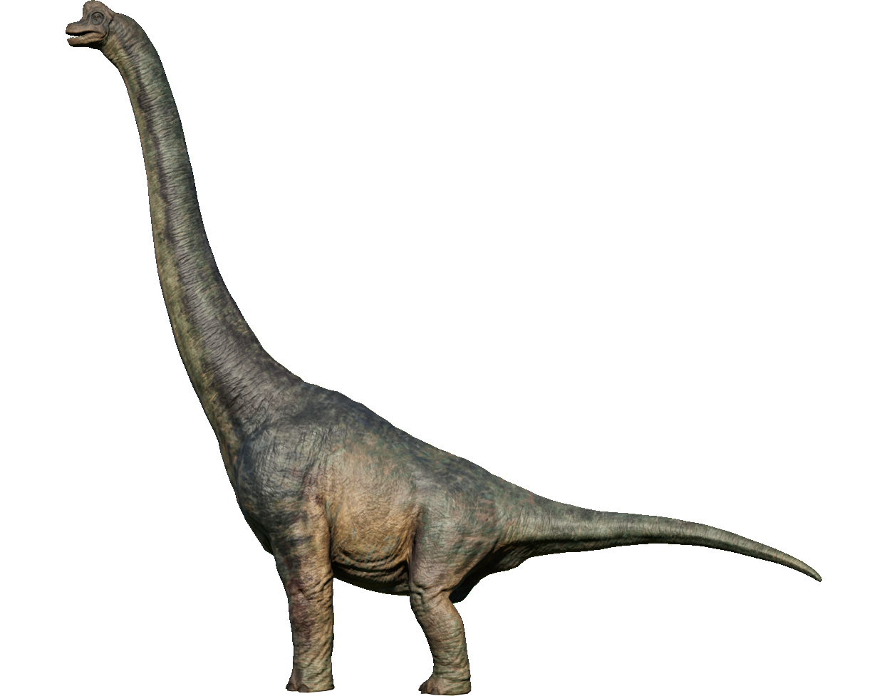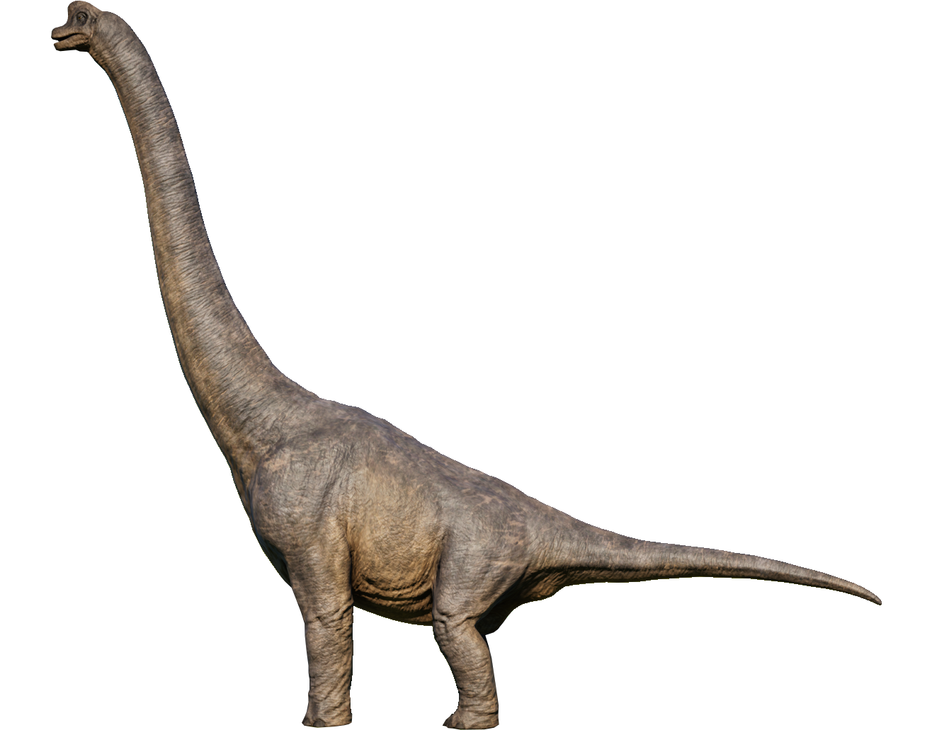 One of the most well-known dinosaurs to the public by virtue of its massive size, Brachiosaurus is a genus of herbivorous sauropod from the Late Jurassic period, around 150 million years ago. It is also one of the largest dinosaurs to have lived, standing around 16 meters tall and weighing in at nearly 60 tons. This makes it a popular attraction for Jurassic World visitors. Its name – which translates to "Arm Lizard" – is derived from the incredible height of its humerus. Brachiosaurus is a massive sauropod dinosaur distinguished by its long, vertical neck and a comparatively short tail. Thanks to its long neck, Brachiosaurus can feed on leaves from the upper reaches of tall trees more than 12 meters high, eating up to 400kg of vegetation every day, while its vast size means any potential predators tend to steer clear. They are known to be warm blooded. It has a grey-brown color, like many other dinosaurs, and has a lighter brown underbelly.