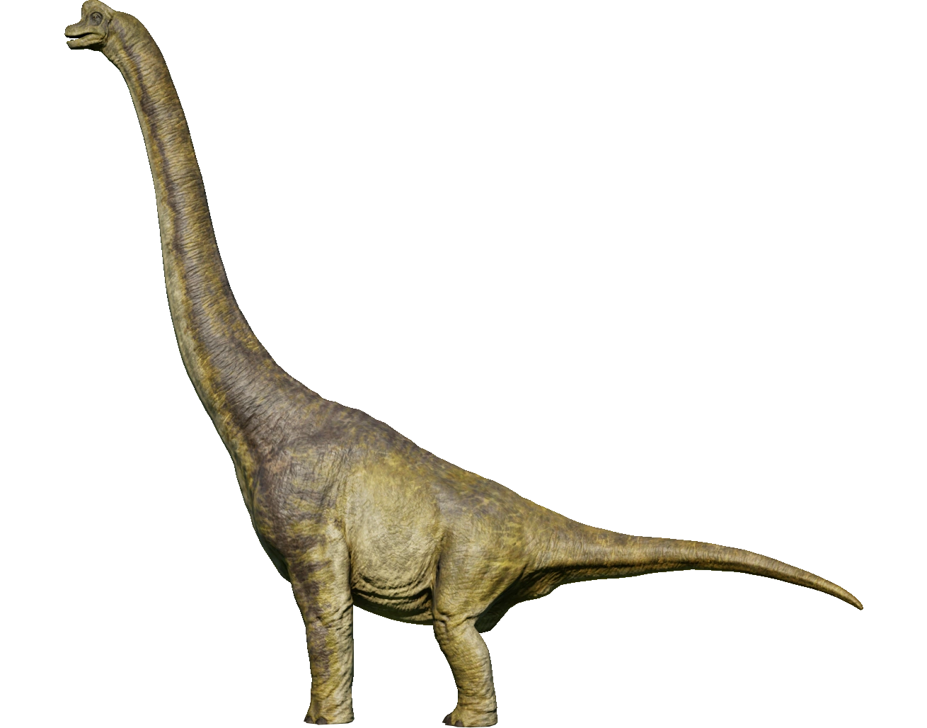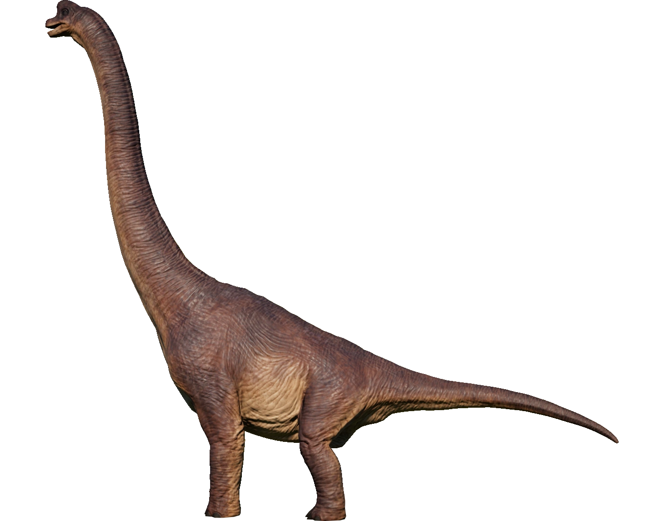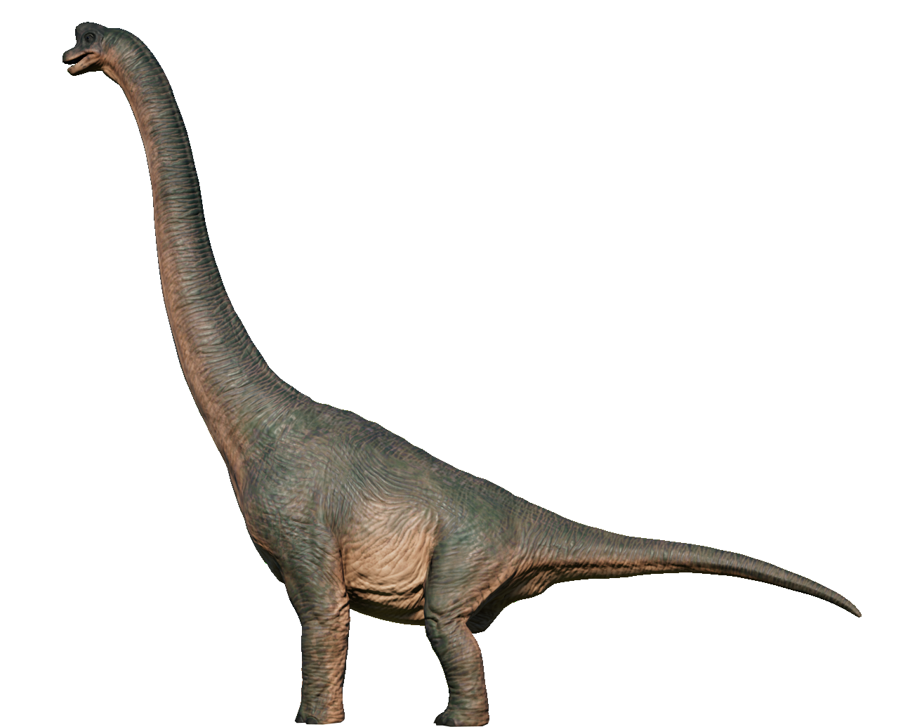 One of the most well-known dinosaurs to the public by virtue of its massive size, Brachiosaurus is a genus of herbivorous sauropod from the Late Jurassic period, around 150 million years ago. It is also one of the largest dinosaurs to have lived, standing around 16 meters tall and weighing in at nearly 60 tons. This makes it a popular attraction for Jurassic World visitors. Its name – which translates to "Arm Lizard" – is derived from the incredible height of its humerus. Brachiosaurus is a massive sauropod dinosaur distinguished by its long, vertical neck and a comparatively short tail. Thanks to its long neck, Brachiosaurus can feed on leaves from the upper reaches of tall trees more than 12 meters high, eating up to 400kg of vegetation every day, while its vast size means any potential predators tend to steer clear. They are known to be warm blooded. It has a grey-brown color, like many other dinosaurs, and has a lighter brown underbelly.