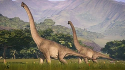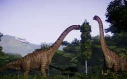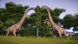In Evolution 2, Brachiosaurus is a peaceful animal, and can live a solitary existence, as well as a modest group of other Brachiosaurus. They tolerate a large group of other dinosaurs in their enclosure, and while they occasionally square off with one another in territorial contests, they are generally an undemanding species.[6]