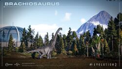 In Evolution, Brachiosaurus is one of the largest species available, and is first unlocked on Isla Tacaño, where its fossils can be excavated from the Cleveland Lloyd Dinosaur Quarry, Garden Park, and Morrison Formation dig sites.
