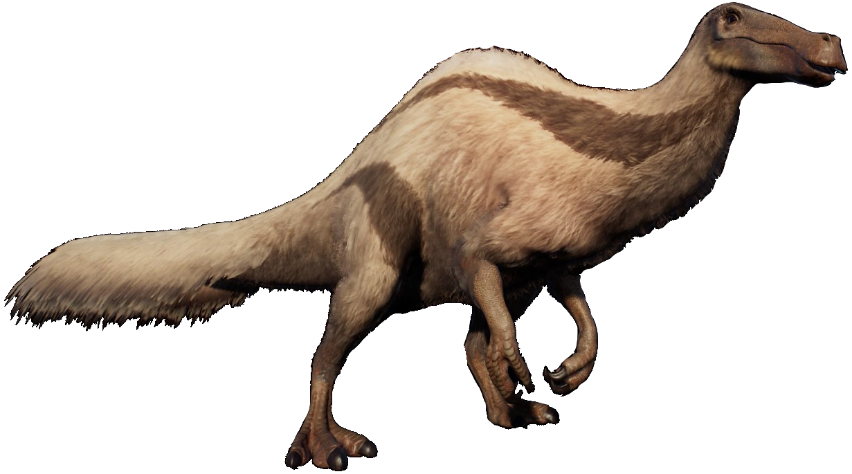 Weighing between 6 and 7 tons and measuring around 11 meters in length, Deinocheirus is by far the largest ornithomimosaurian (or ostrich dinosaur) to have ever been discovered. This genus dates back approximately 70 million years ago to the Late Cretaceous period. Apart from the hybrid dinosaur Spinoceratops, Deinocheirus is for now the only dinosaur in the game to have both herbivore and piscivore diets. Its name translates as "Horrible Hand", in reference to the size of its large, powerful clawed hands bared on its forearms, which were longer than any bipedal dinosaur save for Therizinosaurus. Its fascinating duck-like bill and broad hump makes this remarkable dinosaur a distinctive prehistoric species. Its first base genome has light peach feathers with stripes, and its second base genome has grey-ish feathers.
