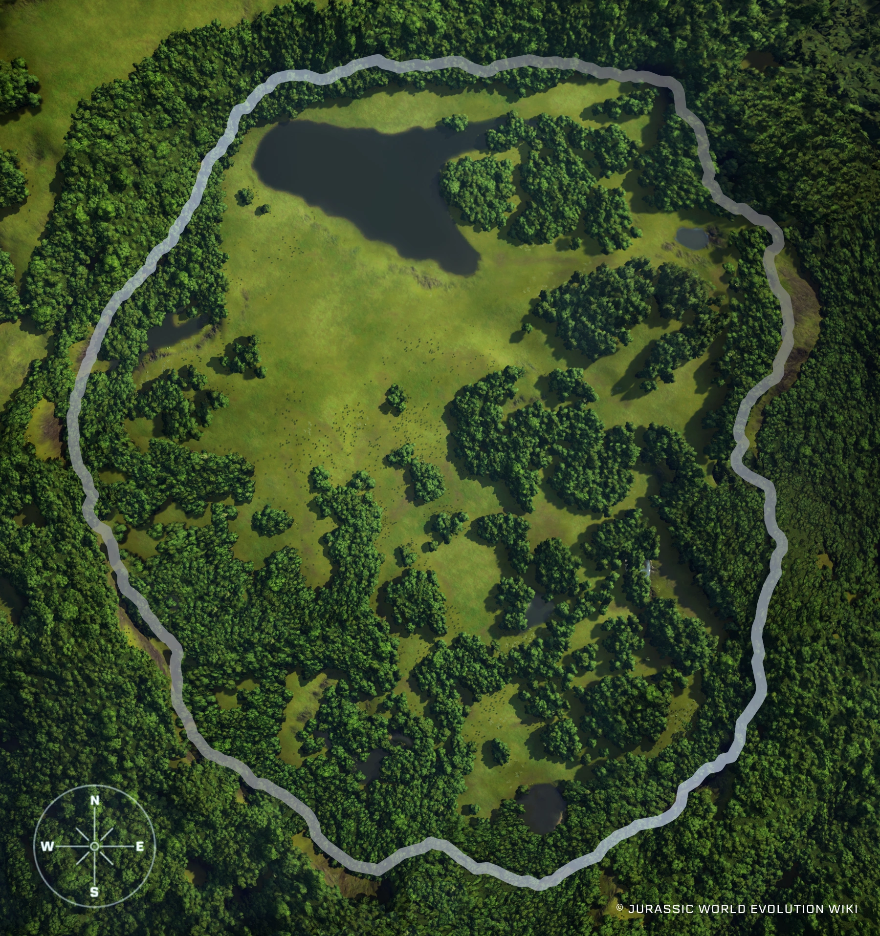 The player immediately begins the Return to Jurassic Park DLC on Isla Nublar - 1993. The island is a large, circular, and mostly open space with numerous dinosaurs either roaming freely or enclosed including three Velociraptors and numerous Triceratops, Gallimimus, Brachiosaurus, Parasaurolophus, and Dilophosaurus. The park is found in a state of emergency with compromised fencing surrounding a central operations facility area containing a damaged Geothermal Power Station and Visitor Center.