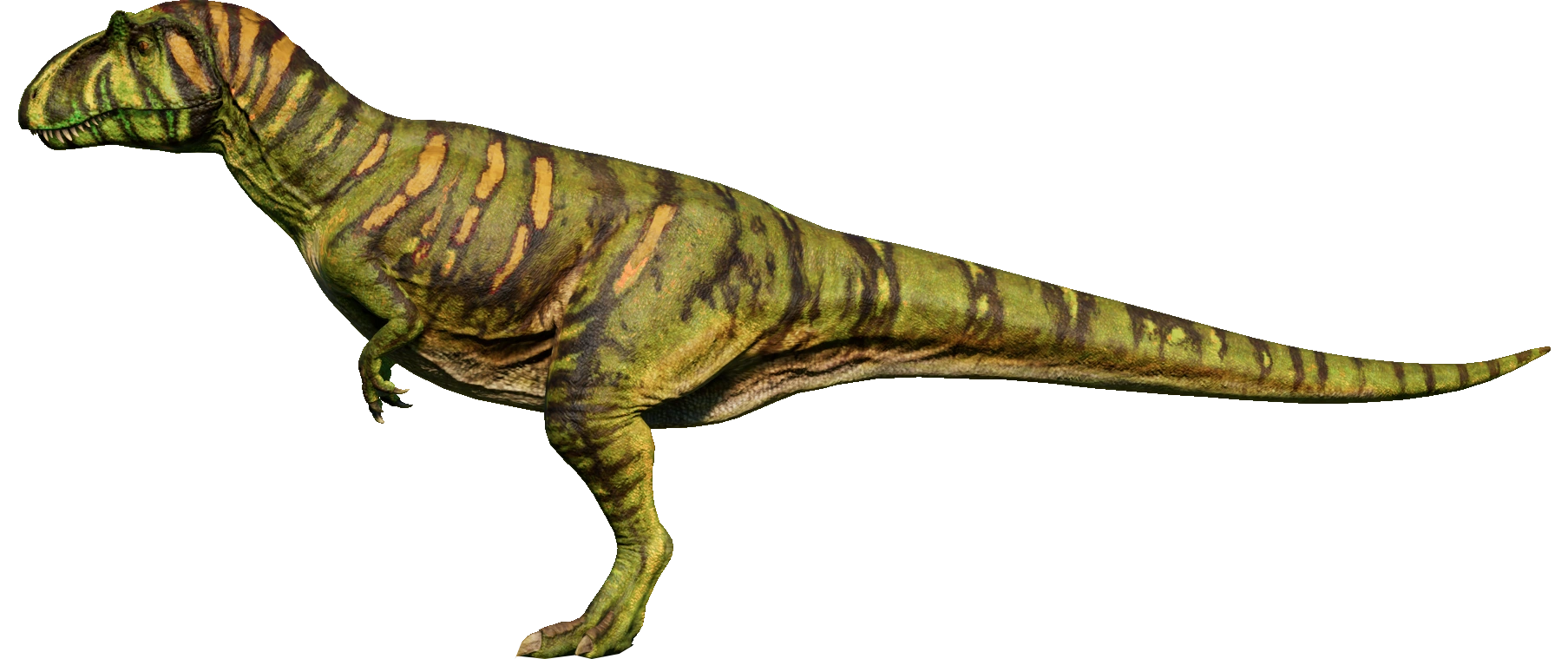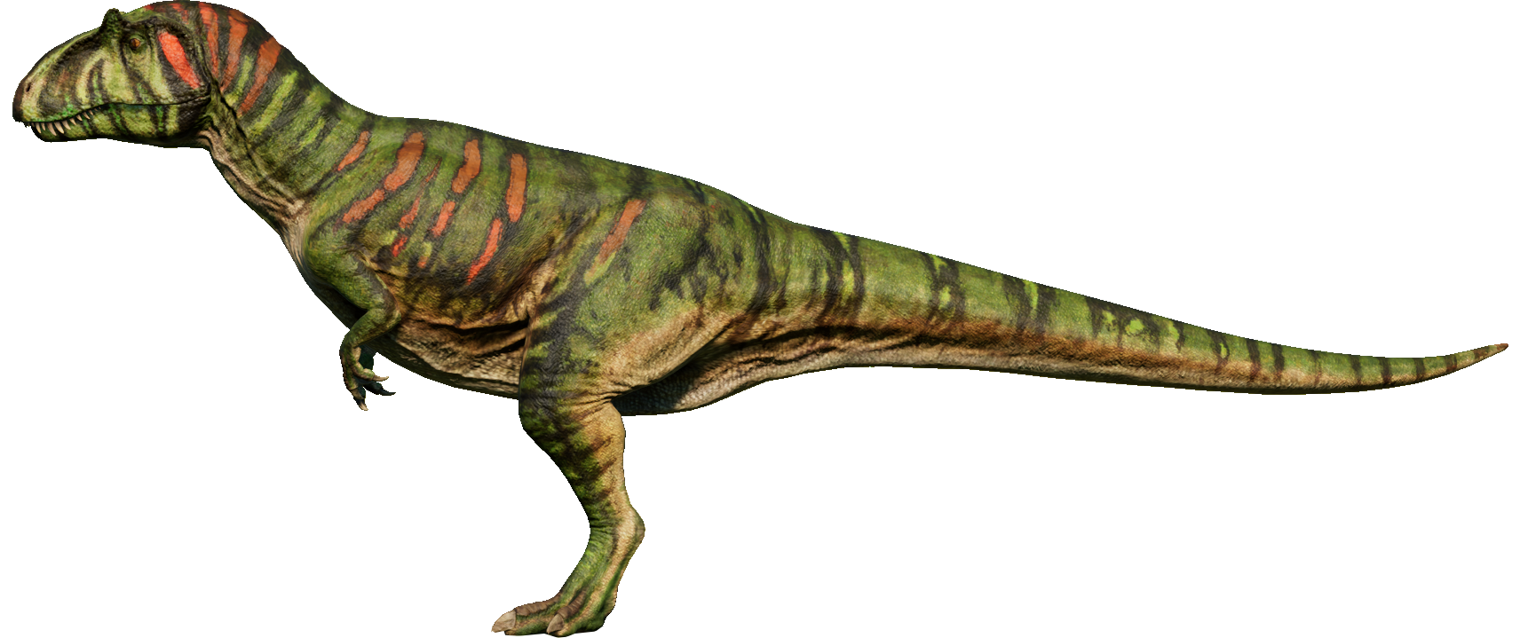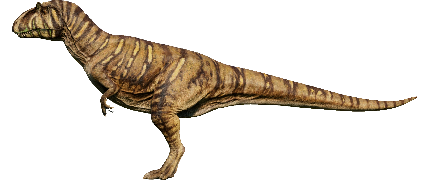 Named after the spines on its vertebrae – the name translates to "Moderately-Spined Lizard" – Metriacanthosaurus is a genus of large carnivorous theropod that existed and once hunted across Europe during the Late Jurassic period. Despite its relatively large size, between seven and eight meters in length and over a ton in weight, Metriacanthosaurus can reach speeds of up to 20 mph and preys on large herbivores. Comparatively little is known about this dinosaur compared to its contemporaries like Allosaurus. The base genome of Metriacanthosaurus has a brown body banded with darker brown stripes. It has green stripes on its head and mouth as well as green crests.