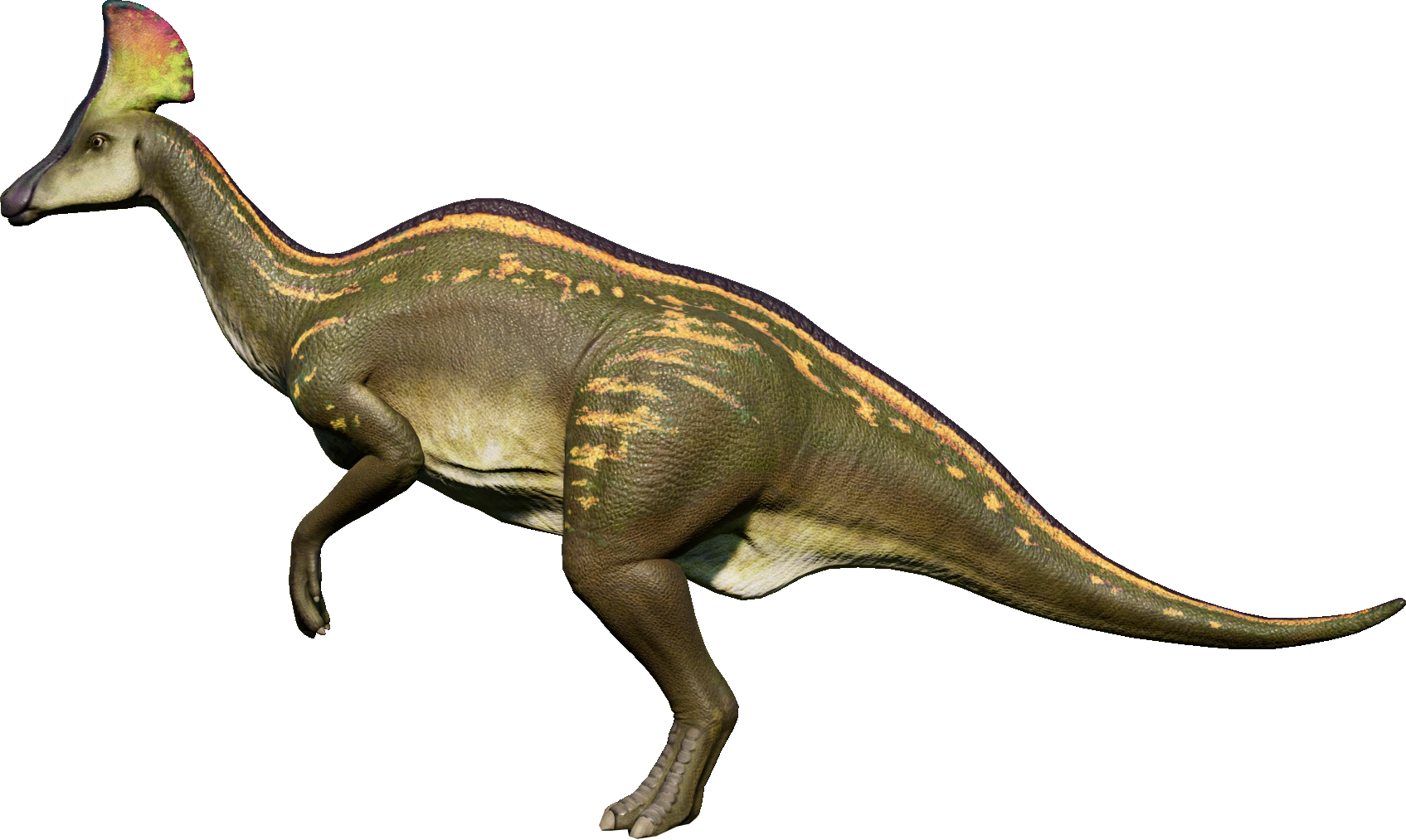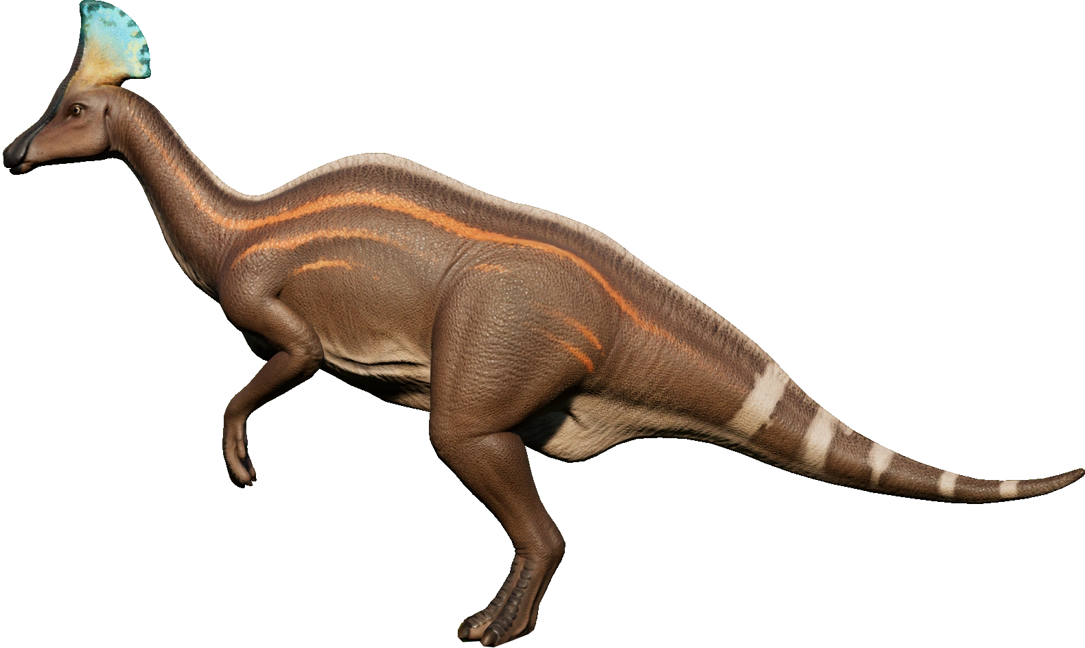 The base genome of the Olorotitan is light brown with creamy underbelly that turn into stripes that cover the tail. They have bright colored crests and additional orange stripes that go along the body.