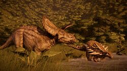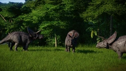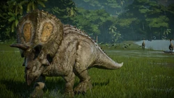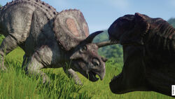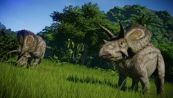 Torosaurus is a somewhat social animal and requires at least one more of its own kind to maintain a healthy comfort level but otherwise has a low maximum social and population limit. Additionally, Torosaurus is capable of living somewhat peacefully alongside small carnivores such as Proceratosaurus and Velociraptor, only occasionally engaging in non-fatal territorial fights.