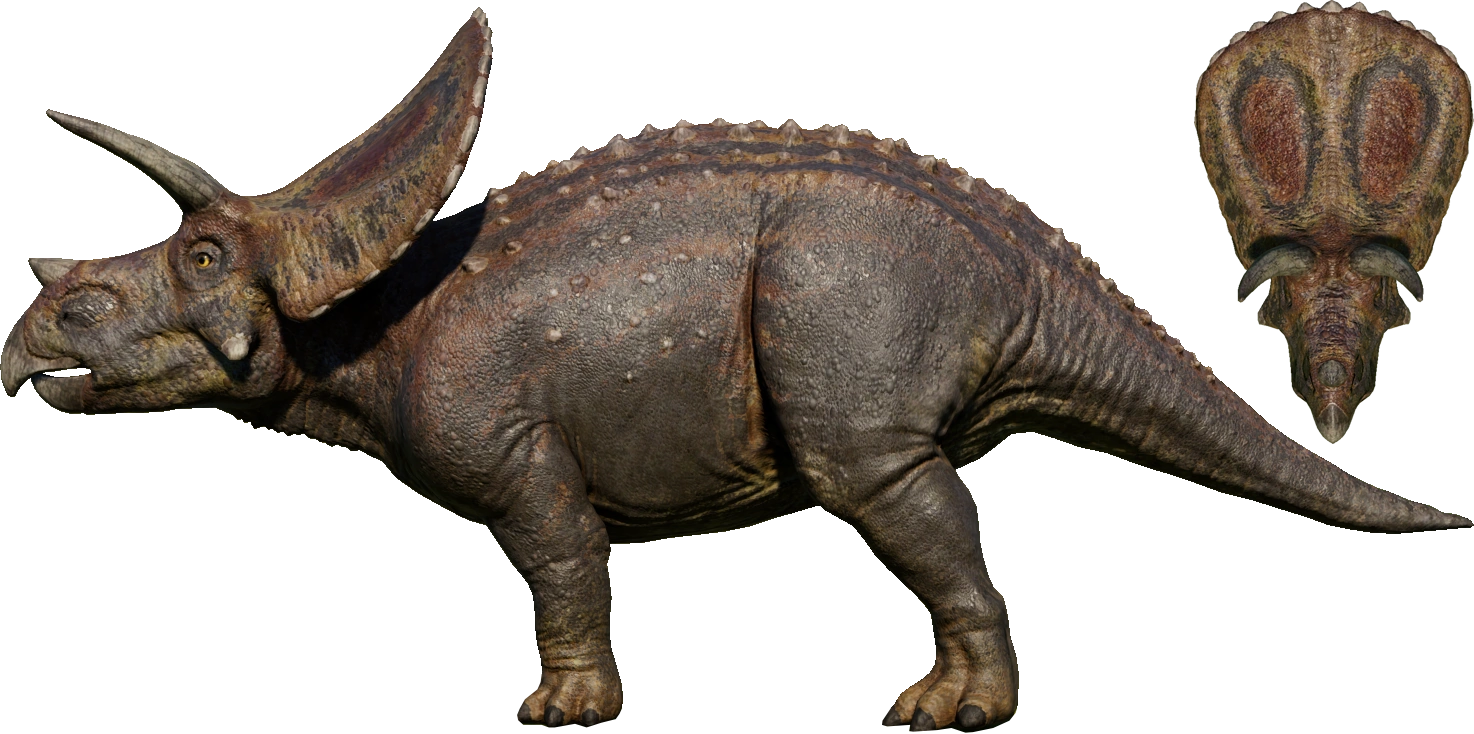 Among the larger ceratopsians and notable for having the largest skull of any terrestrial animal the world has ever seen, measuring up to three meters in length, Torosaurus is a herbivorous ceratopsid dinosaur that lived across the western interior of North America during the Late Cretaceous period, around 65 million years ago. Torosaurus has a large bulky body, a wide, sweeping frill, and three horns; one on its snout and two above its eyes. Similar in size and appearance to its relative, Triceratops, Torosaurus measures nearly eight meters in length and weighs up to six tons, requiring a huge amount of vegetation every day for sustenance. Its beak and shearing teeth allow it to eat tough vegetation like palms and horsetails. Fossil remains have shown that its neck frill on its skull contained two large holes, lending the genus its name, which translates to "Perforated Lizard". It has been suggested that Torosaurus is actually a mature form of Triceratops, but this hasn't been proven as yet. In Evolution, the dinosaur's base cosmetic genome is mostly a pale grayish color with some dark gray markings on its back and light reddish spot-like circles surrounded by white rings on its frill. It has scites, which would be accurate for modern-day reconstructions of ceratopsians. In Evolution 2, the red stop-like circles remained, however its cosmetic genome is dirty emerald green.