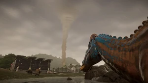 Infrastructure damage can be negated through building upgrades, but if a building is destroyed it must be fixed by a ranger team. Dinosaur damage cannot be negated however, and any dinosaur injured by a storm must be treated or moved to a Paleo-Medical Facility. A storm will cause the comfort of all dinosaurs to lower by 10%, which can be problematic for dinosaurs with high comfort thresholds such as Velociraptor. Storms can vary wildly depending on whatever biome the player has settled in, each coming with different effects. Tropical Storms will darken the sky and release heavy rains, and this is the only weather tornados will form in. Snowstorms will also cause the sky to darken but will release heavy snow. Due to the snow accumulated on the ground, vehicles will be halted and unable to move until the storm subsides. Sandstorms cause visibility to be lowered through a high layer of sand flying across the screen, and will cause all electricity not utilizing a backup generator to fail.